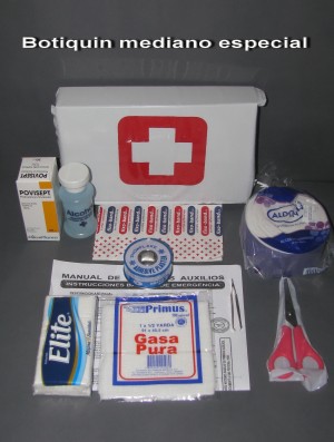 1 termómetro clinico,1 tijera punta roma, 1 pinza metálica, 3 botella de alcohol desnaturalizado 60cc 90°, 1 botella de povidona yodada 30cc, 1 rollo tela adhesiva 1.25 cms x 5 mts, 1 empaque de algodón hidrofilo grande 50 grs, 1 bolsa gasa hidrofila de ½ yarda, material para cabrestrillo (tela blanca no tejida), 1 vaso desechable 300cc, 1 paquete pañuelos desechables, 1 instructivo de primeros auxilios, 28 unidades vendas adhesivas, 10 dipironas, 2 tablillas de madera, 1 trozo de madera de 15cms, 25 unidades cotonitos algodón.